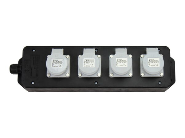 Bestückung:4 CEE-Steckdosen 16A 42V 2p 12h IP 4415m Gummileitung H07RN-F 2X2,5mm² schwarz mitCEE-Stecker 16A 42V 2p 12h IP 44