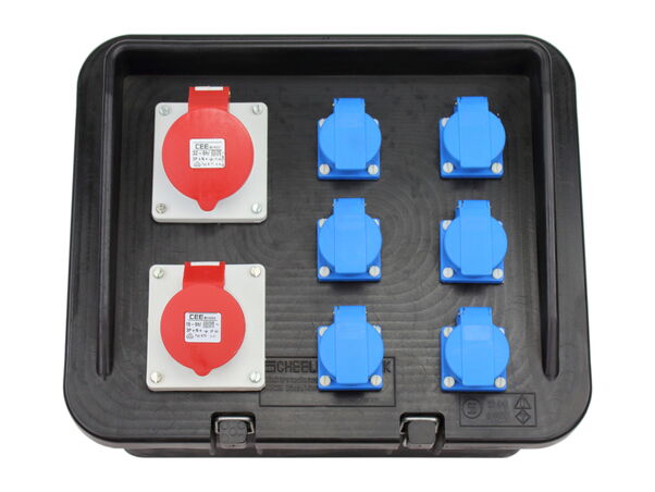 Bestückung:1 CEE-Steckdose 32A 400V 5p 6h IP 44 abgesichert mit1 C-Automat 32A 3p1 CEE-Steckdose 16A 400V 5p 6h IP 44 abgesichert mit1 C-Automat 16A 3p6 SCHUKO-Steckdosen 16A 230V IP 54 abgesichert mit6 C-Automaten 16A 1p1 FI-Schutzschalter 63A 0,03A 4p Typ A für alle AusgängeKabelverschraubung M40 oben