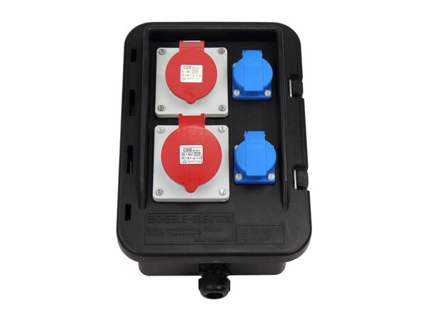 Bestückung:1 CEE-Steckdose 32A 400V 5p 6h IP 44 abgesichert mit1 C-Automat 32A 3p1 CEE-Steckdose 16A 400V 5p 6h IP 44 abgesichert mit1 C-Automat 16A 3p2 SCHUKO-Steckdosen 16A 230V IP 54 abgesichert mit2 C-Automaten 16A 1p1 FI-Schutzschalter 40A 0,03A 4p Typ A für alle AusgängeKabelverschraubung M32 unten