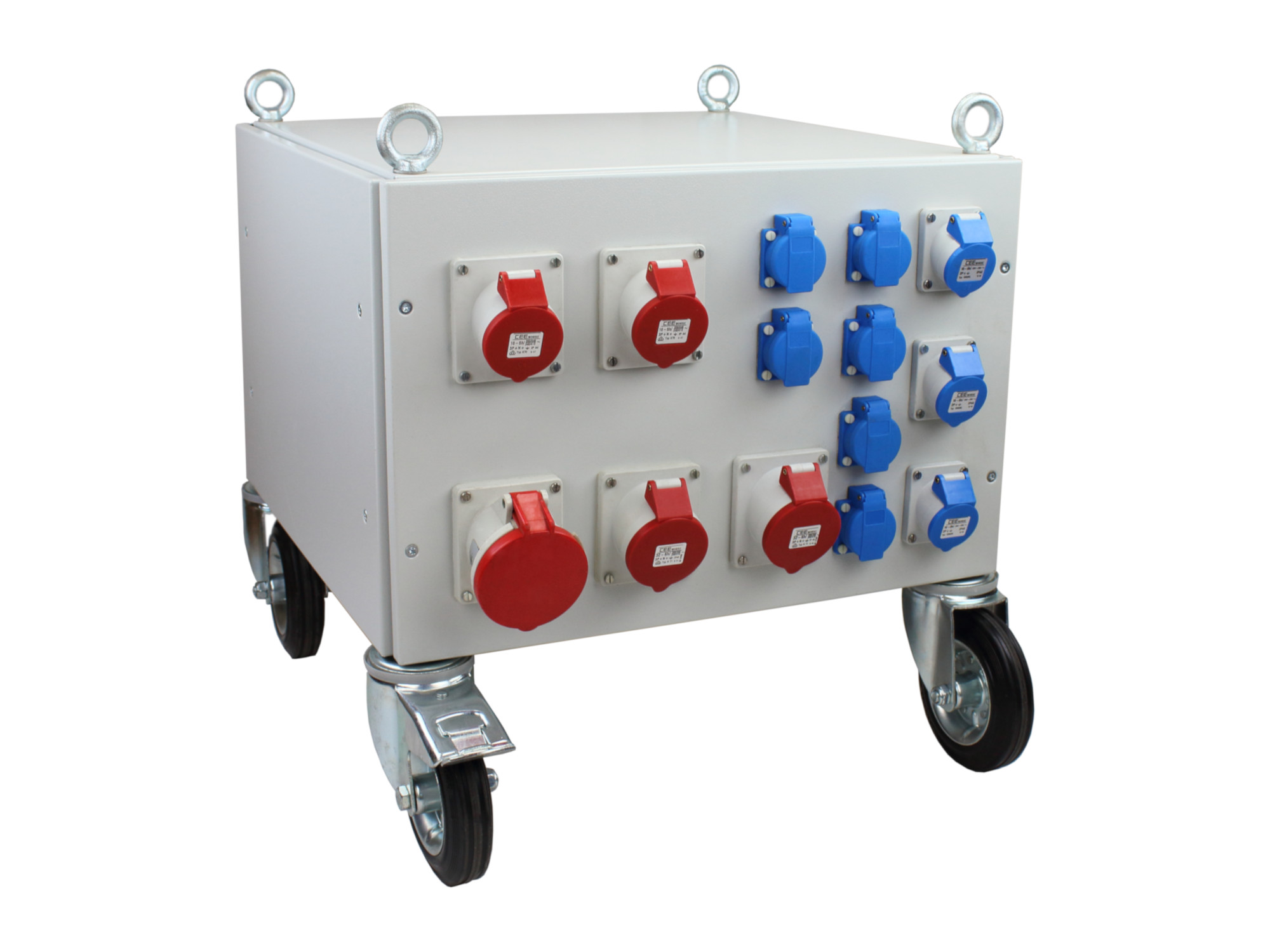 • Stahlblechgehäuse mit vier Kranösen und vier Gummi Lenkrollen, davon zwei mit Feststellbremse.