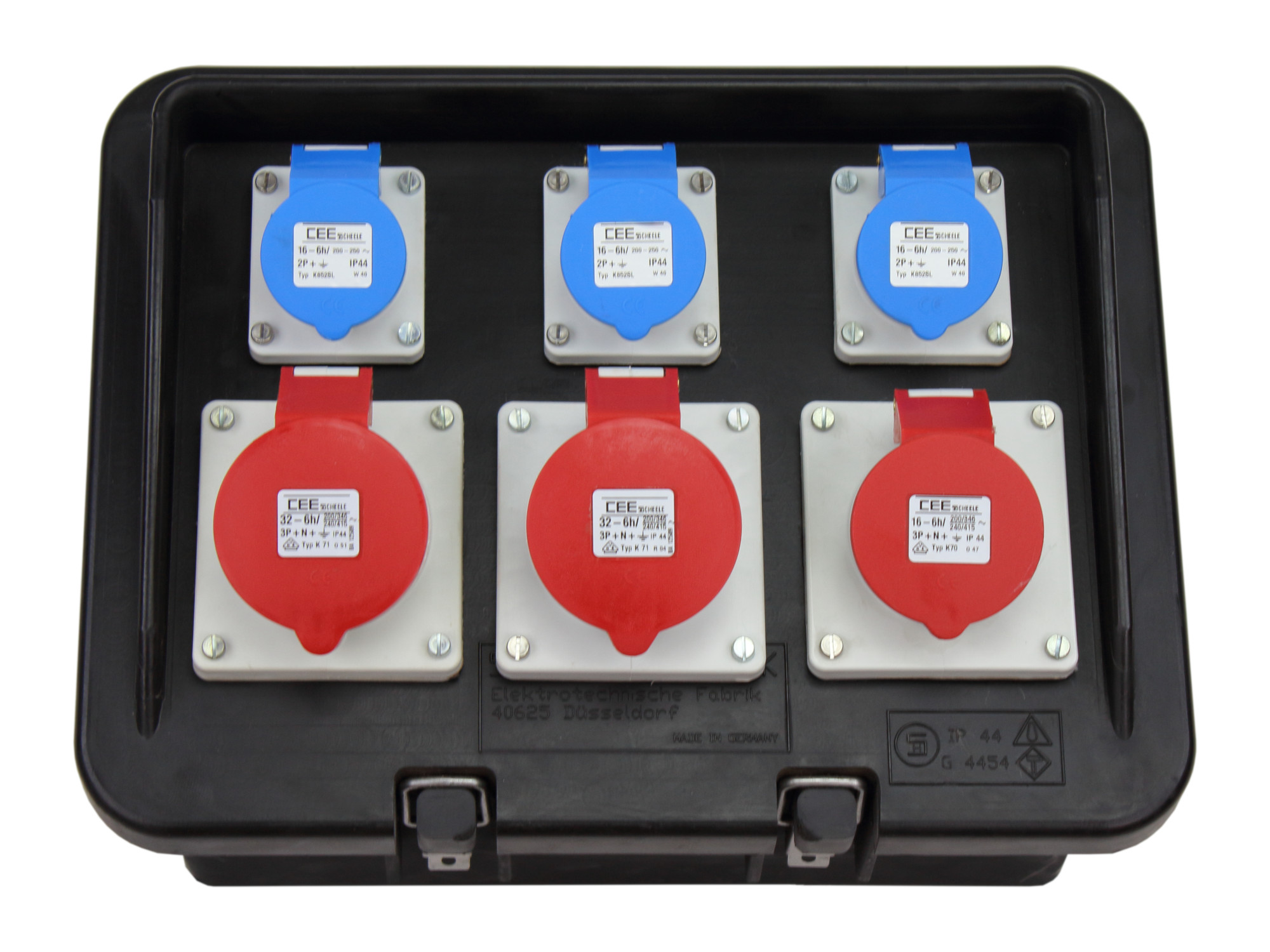 Bestückung:2 CEE-Steckdosen 32A 400V 5p 6h IP 44 abgesichert mit2 C-Automaten 32A 3p1 CEE-Steckdose 16A 400V 5p 6h IP 44 abgesichert mit1 C-Automat 16A 3p3 CEE-Steckdosen 16A 230V 3p 6h IP 44 abgesichert mit3 C-Automaten 16A 1p1 FI-Schutzschalter 63A 0,03A 4p Typ A für alle AusgängeKabelverschraubung M40 oben
