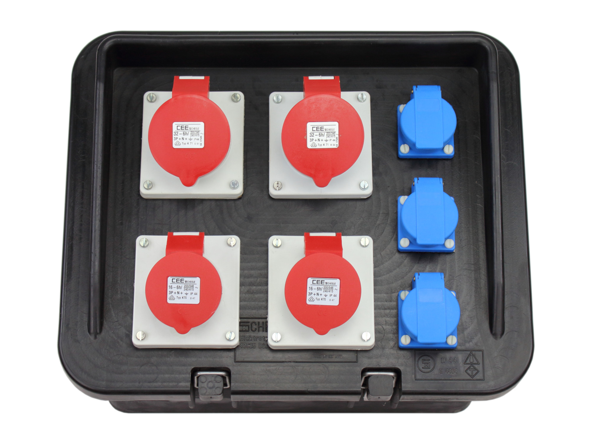 Bestückung:2 CEE-Steckdosen 32A 400V 5p 6h IP 44 abgesichert mit2 C-Automaten 32A 3p2 CEE-Steckdosen 16A 400V 5p 6h IP 44 abgesichert mit2 C-Automaten 16A 3p3 SCHUKO-Steckdosen 16A 230V IP 54 abgesichert mit3 C-Automaten 16A 1p1 FI-Schutzschalter 63A 0,03A 4p Typ A für alle AusgängeKabelverschraubung M40 unten