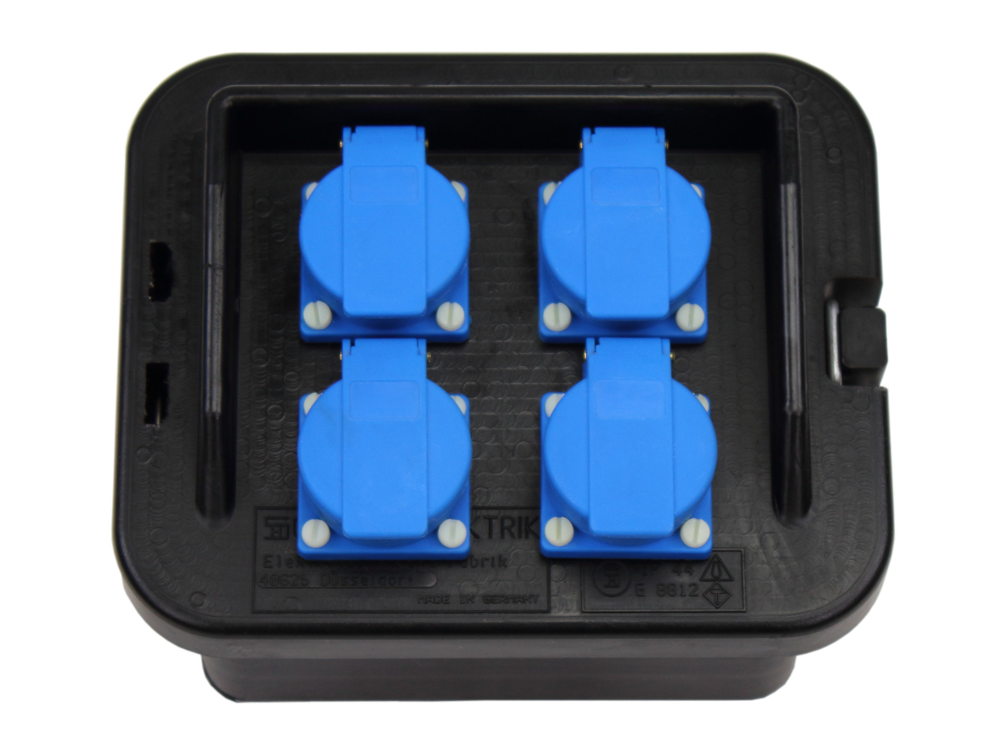 Bestückung:4 SCHUKO-Steckdosen 16A 230V IP 54 paarweise abgesichert mit4 C-Automaten 16A 1-polig1 FI-Schutzschalter 25A 0,03A 2p Typ A für alle AusgängeKabelverschraubung M20 unten