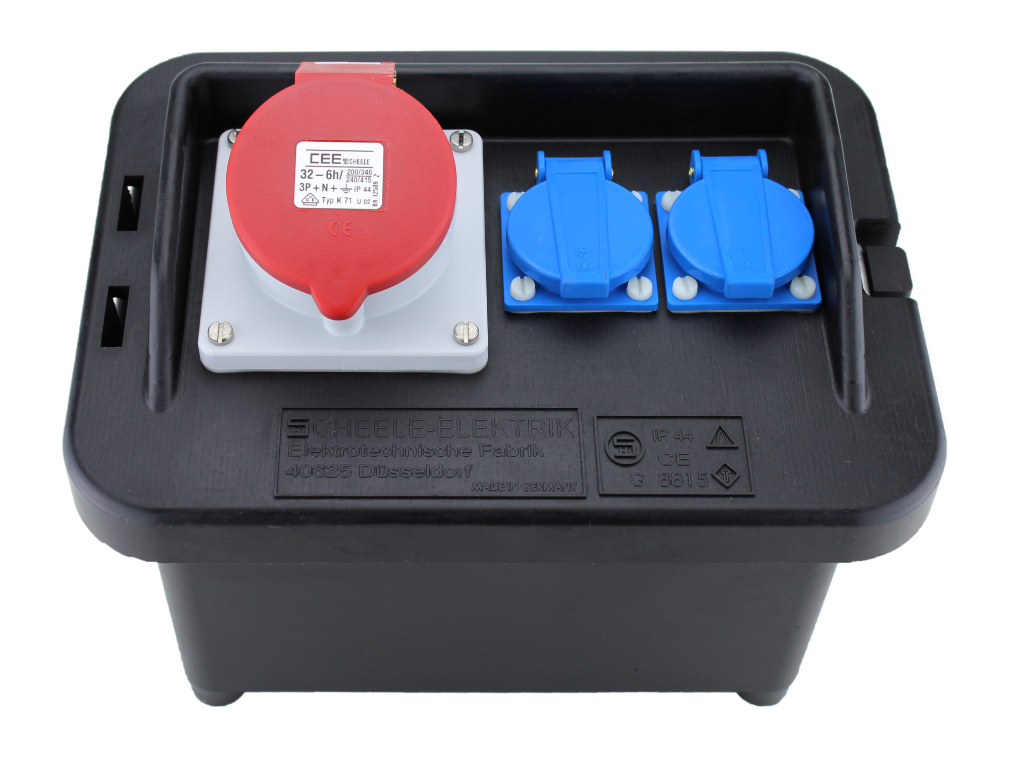 Bestückung:1 CEE-Steckdose 32A 400V 5p 6h IP 44 abgesichert mit1 C-Automat 32A 3p2 SCHUKO-Steckdosen 16A 230V IP 54 abgesichert mit2 C-Automaten 16A 1p1 FI-Schutzschalter 40A 0,03A 4p Typ A für alle AusgängeKabelverschraubung M32 unten