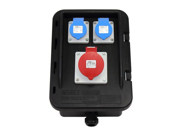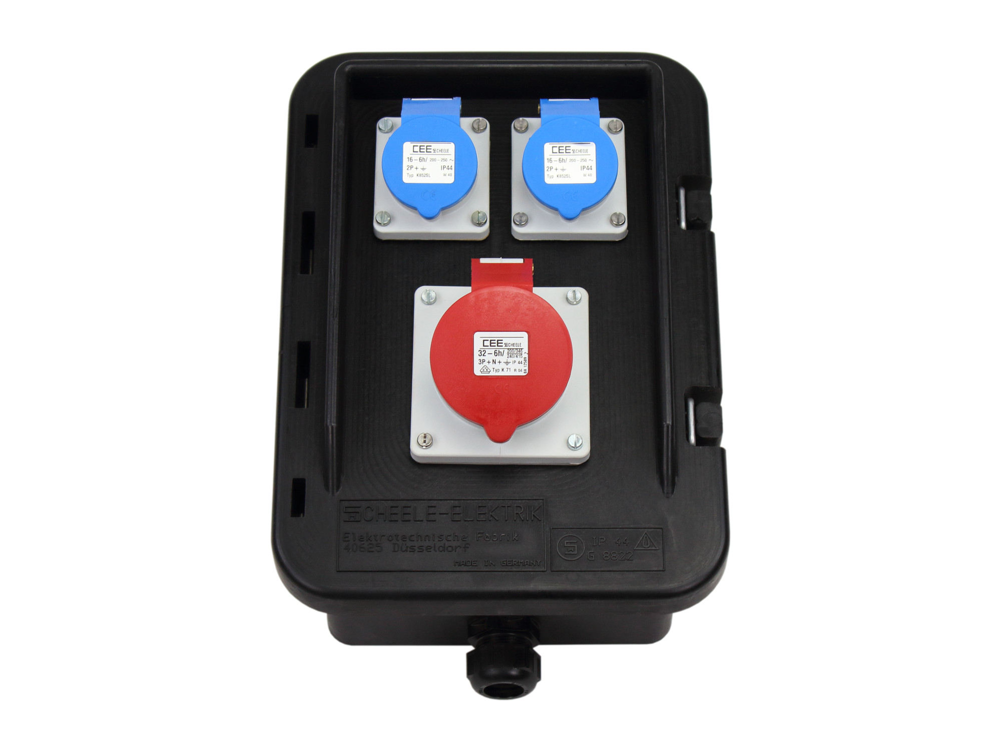 Bestückung:1 CEE-Steckdose 32A 400V 5p 6h IP 44 abgesichert mit1 C-Automat 32A 3p2 CEE-Steckdosen 16A 230V 3p 6h IP 44 abgesichert mit2 C-Automaten 16A 1p1 FI-Schutzschalter 40A 0,03A 4p Typ A für alle AusgängeKabelverschraubung M32 unten