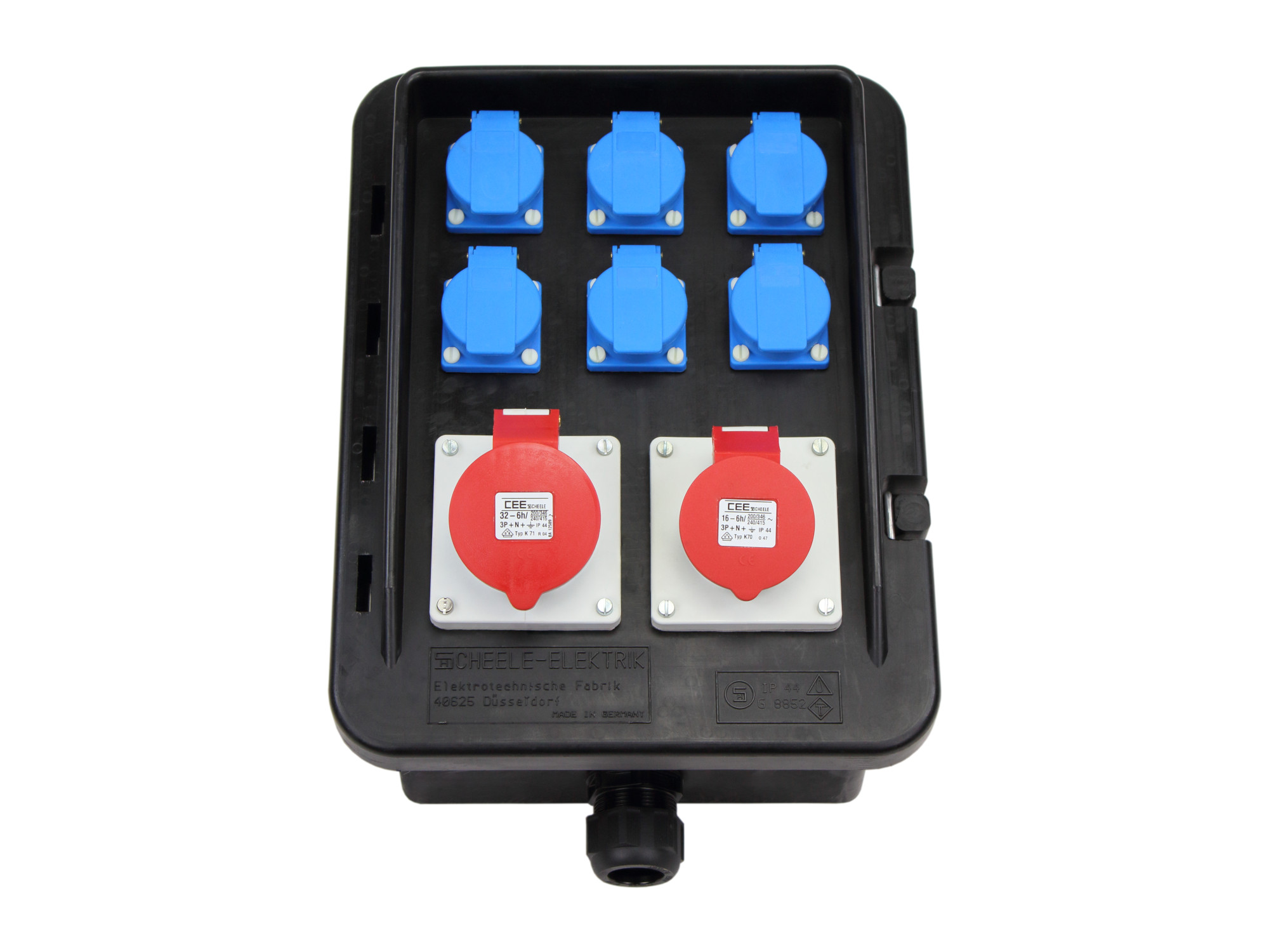 Bestückung:1 CEE-Steckdose 32A 400V 5p 6h IP 44 abgesichert mit1 C-Automat 32A 3p1 CEE-Steckdose 16A 400V 5p 6h IP 44 abgesichert mit1 C-Automat 16A 3p6 SCHUKO-Steckdosen 16A 230V IP 54 abgesichert mit6 C-Automaten 16A 1p1 FI-Schutzschalter 63A 0,03A 4p Typ A für alle AusgängeKabelverschraubung M40 unten