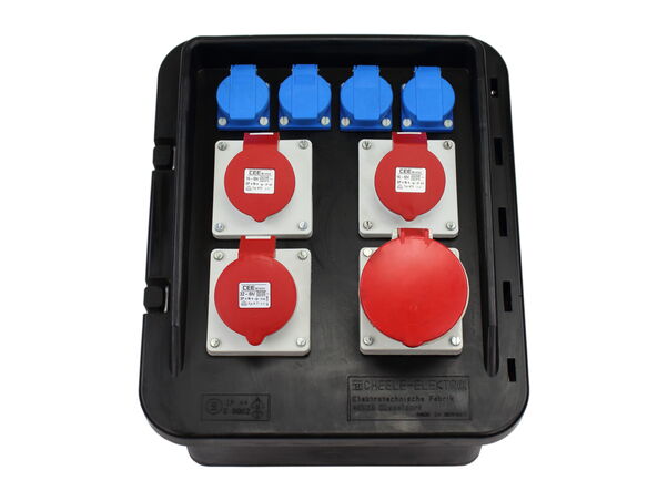 Bestückung:1 CEE-Steckdose 63A 400V 5p 6h IP 44 abgesichert mit1 C-Automat 63A 3p1 CEE-Steckdose 32A 400V 5p 6h IP 44 abgesichert mit1 C-Automat 32A 3p2 CEE-Steckdosen 16A 400V 5p 6h IP 44 abgesichert mit2 C-Automaten 16A 3p4 SCHUKO-Steckdosen 16A 230V IP 54 abgesichert mit4 C-Automaten 16A 1p1 FI-Schutzschalter 63A 0,03A 4p Typ A für alle AusgängeKabelverschraubung M50 oben
