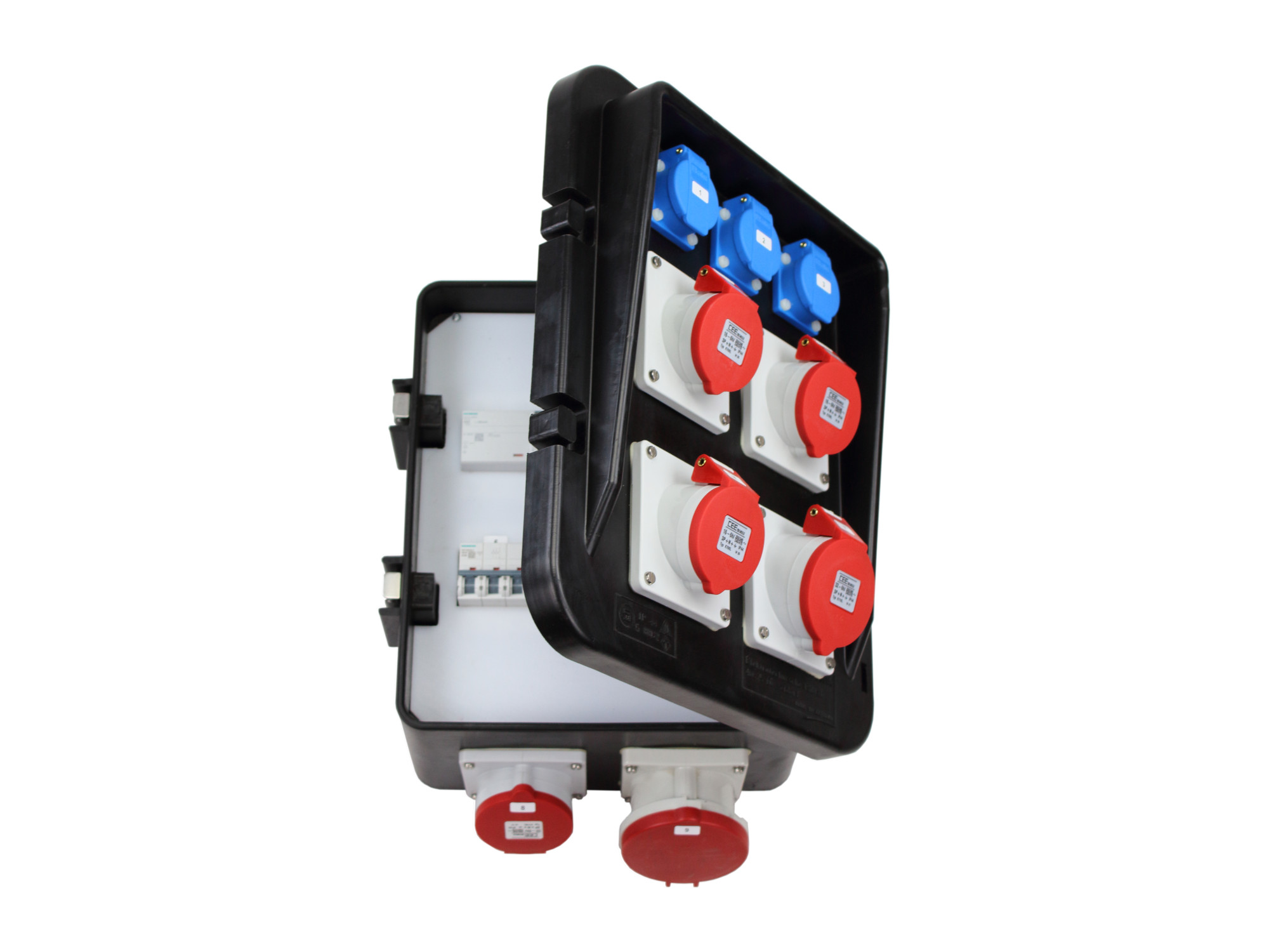 Bestückung:1 CEE-Steckdose 63A 400V 5p 6h IP 44 abgesichert mit1 C-Automat 63A 3p2 CEE-Steckdosen 32A 400V 5p 6h IP 44 abgesichert mit2 C-Automaten 32A 3p3 CEE-Steckdosen 16A 400V 5p 6h IP 44 abgesichert mit3 C-Automaten 16A 3p3 SCHUKO-Steckdosen 16A 230V IP 54 abgesichert mit3 C-Automaten 16A 1p1 FI-Schutzschalter 63A 0,03A 4p Typ A für alle AusgängeKabelverschraubung M50 oben