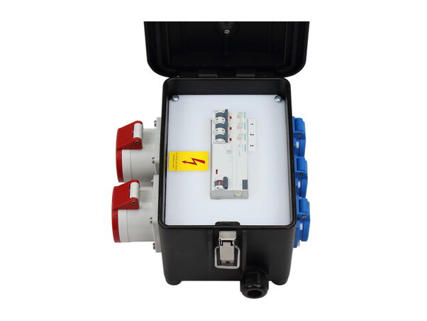 Bestückung:2 CEE-Steckdosen 32A 400V 5p 6h IP 44 durchverdrahtet über FI3 SCHUKO-Steckdosen 16A 230V IP 54 abgesichert mit3 C-Automaten 16A 1-polig1 FI-Schutzschalter 40A 0,03A 4p Typ A für alle AusgängeKabelverschraubung M32(Ohne Zuleitung)