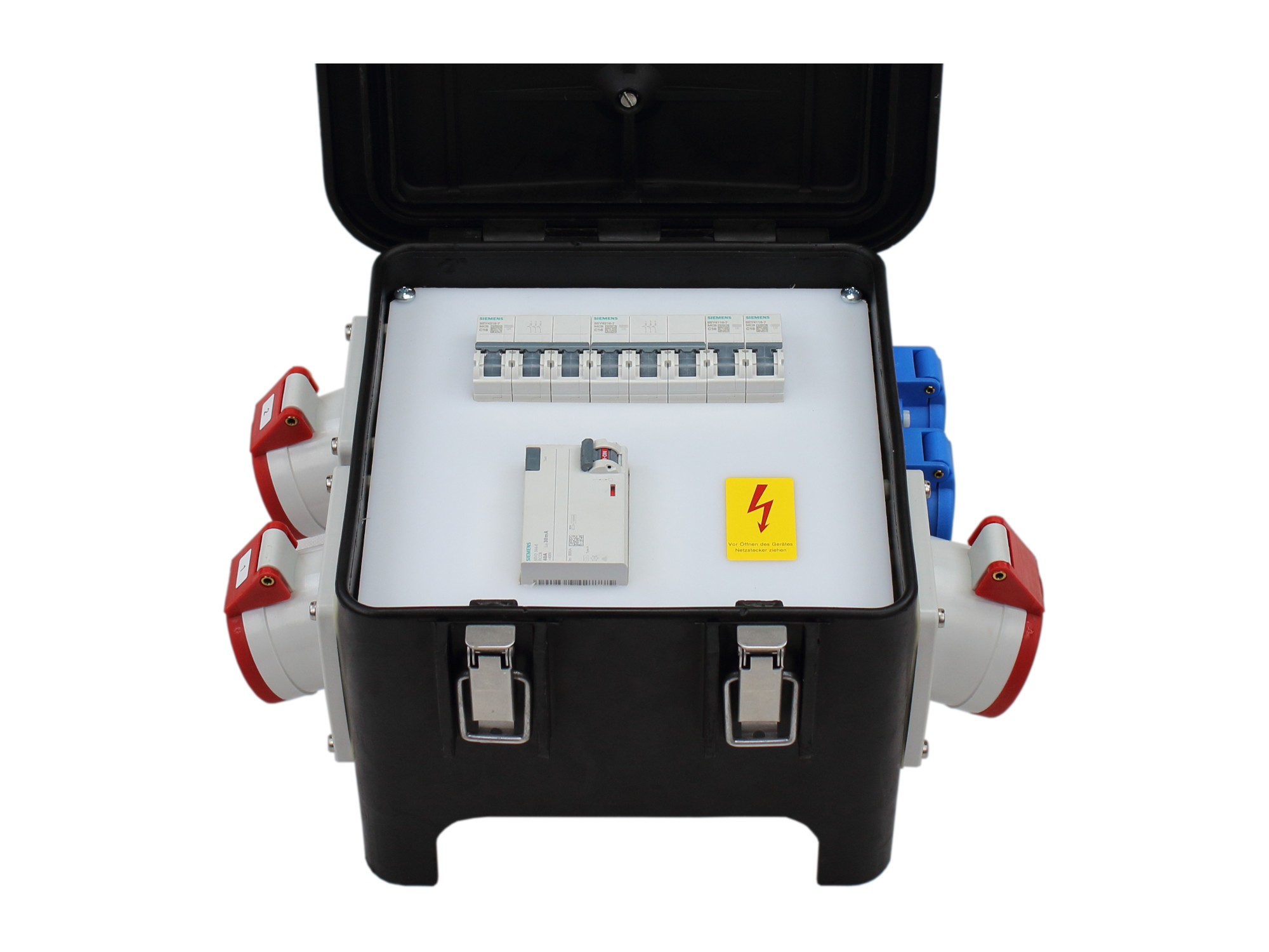 Bestückung:1 CEE-Steckdose 32A 400V 5p 6h IP 44 durchverdrahtet über FI2 CEE-Steckdosen 16A 400V 5p 6h IP 44 abgesichert mit2 C-Automaten 16A 3p2 SCHUKO-Steckdosen 16A 230V IP 54 abgesichert mit2 C-Automaten 16A 1-polig1 FI-Schutzschalter 40A 0,03A 4p Typ A für alle AusgängeCEE-Gerätestecker 32A 400V 5p 6h IP44