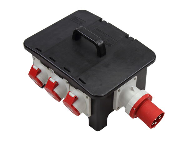 Bestückung:3 CEE-Steckdosen 32A 400V 5p 6h IP 44 abgesichert mit3 NEOZED D02 3p3 SCHUKO-Steckdosen 16A 230V IP 54 abgesichert mit3 NEOZED D01 1p1 FI-Schutzschalter 63A 0,03A 4p Typ A für alle AusgängeCEE-Gerätestecker 63A 400V 5p 6h IP67