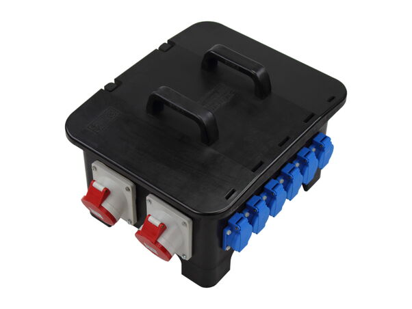 Bestückung:2 CEE-Steckdosen 32A 400V 5p 6h IP 44 abgesichert mit2 C-Automaten 32A 3p2 CEE-Steckdosen 16A 400V 5p 6h IP 44 abgesichert mit2 C-Automaten 16A 3p6 SCHUKO-Steckdosen 16A 230V IP 54 abgesichert mit6 C-Automaten 16A 1p1 FI-Schutzschalter 63A 0,03A 4p Typ A für alle AusgängeKabelverschraubung M40(Ohne Zuleitung)