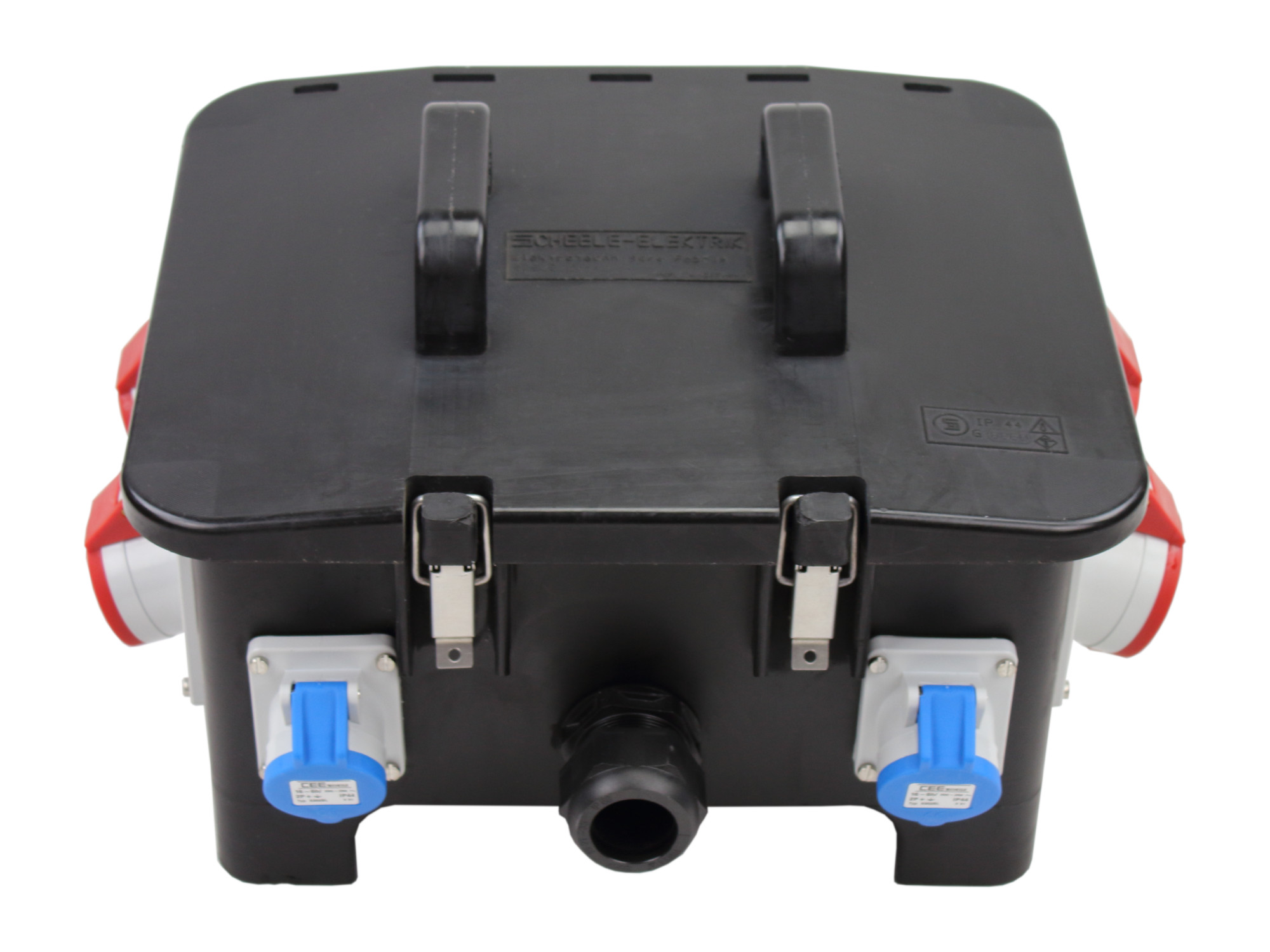 Bestückung:3 CEE-Steckdosen 32A 400V 5p 6h IP 44 abgesichert mit3 NEOZED D02 3p1 CEE-Steckdose 16A 400V 5p 6h IP 44 abgesichert mit1 C-Automat 16A 3p6 CEE-Steckdosen 16A 230V 3p 6h IP 44 abgesichert mit6 C-Automaten 16A 3p1 FI-Schutzschalter 63A 0,03A 4p Typ A für alle AusgängeKabelverschraubung M40(Ohne Zuleitung)